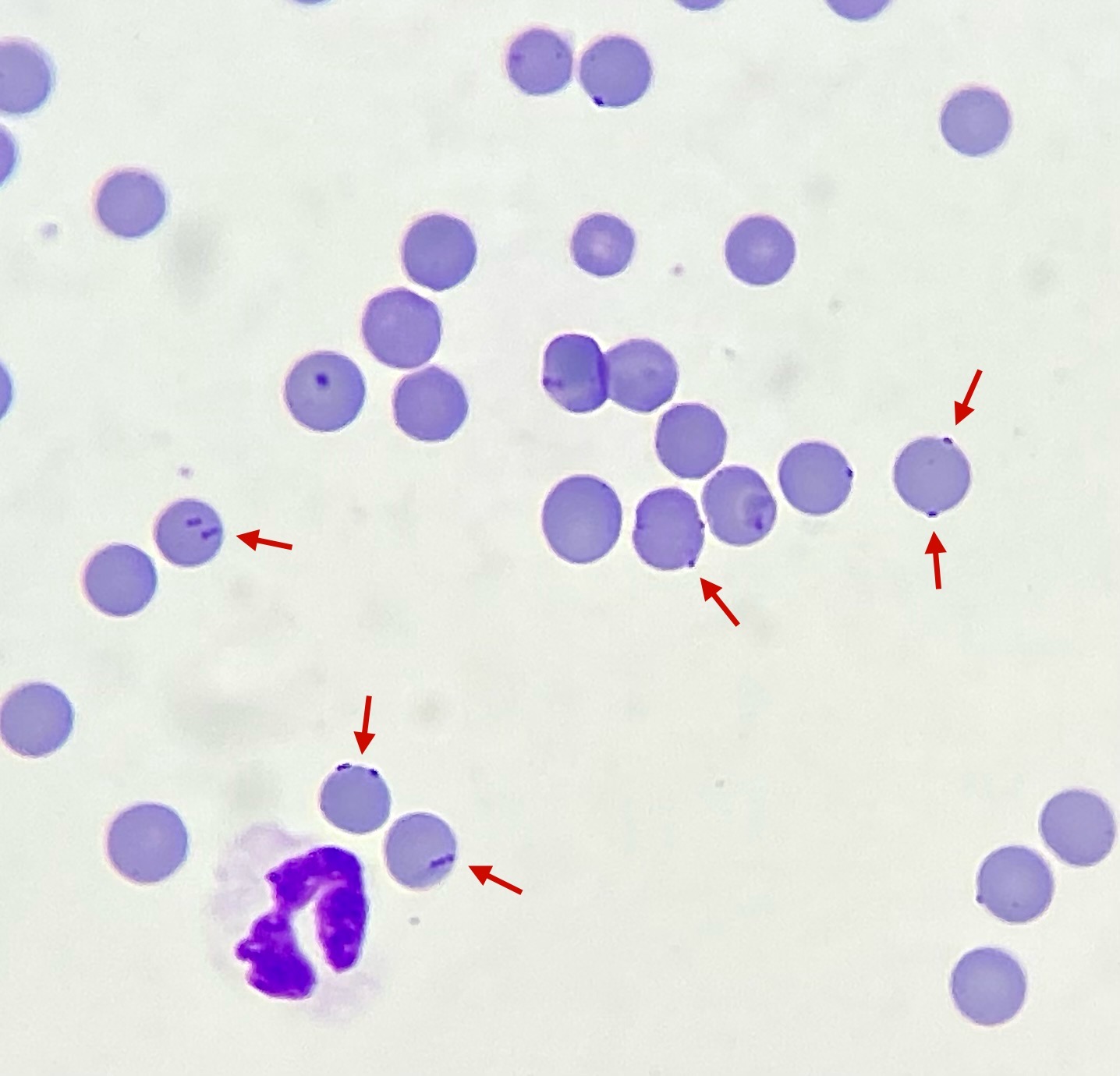 Al microscopio, los micoplasmas se reconocen como pequeñas estructuras azules y redondas en la superficie de los eritrocitos. A veces también son visibles como estructuras anulares u oblongas.