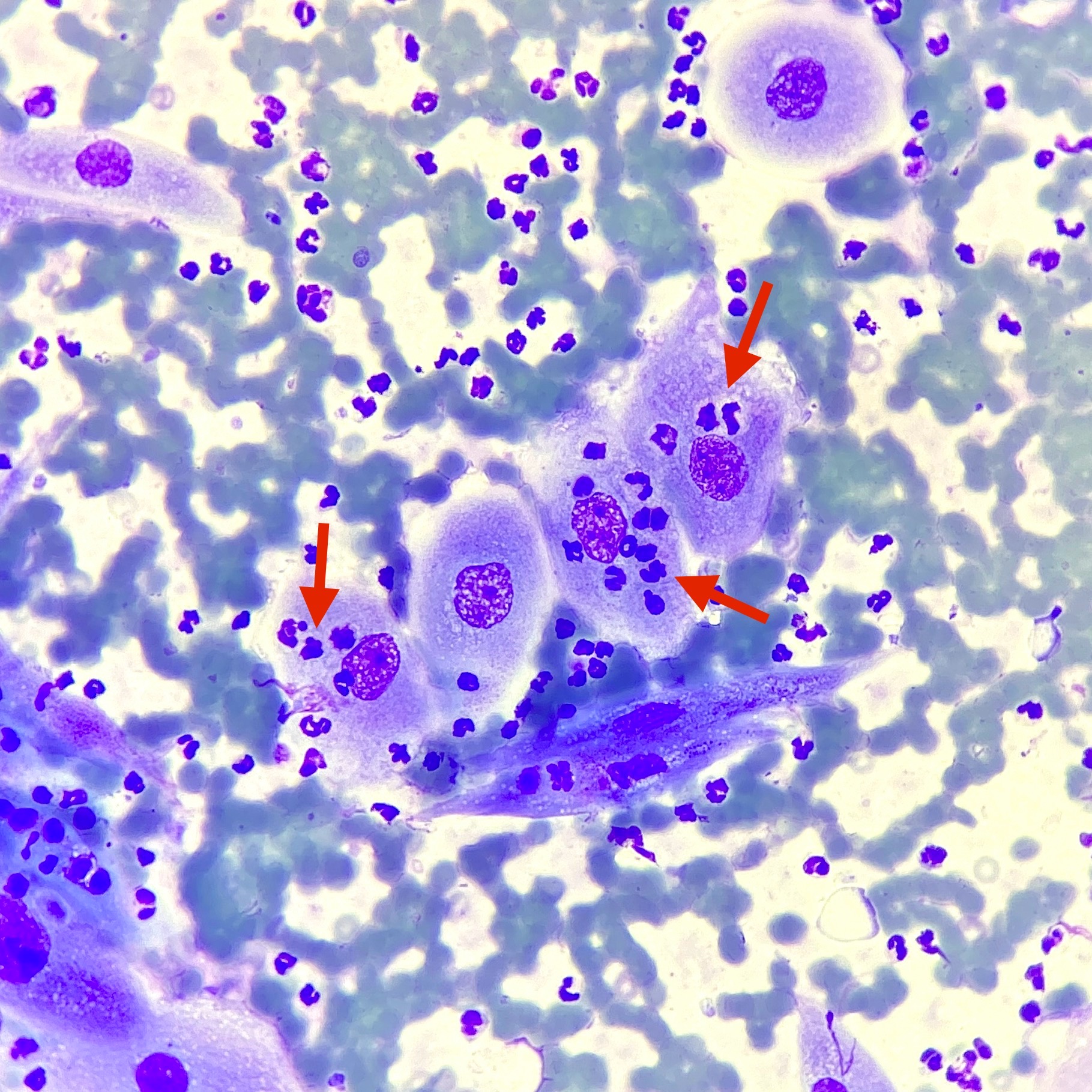 La emperipolesis se observa, por ejemplo, en carcinomas de células escamosas en perros y gatos. Las flechas rojas señalan neutrófilos que se encuentran dentro del citoplasma de epitelios escamosos neoplásicos.